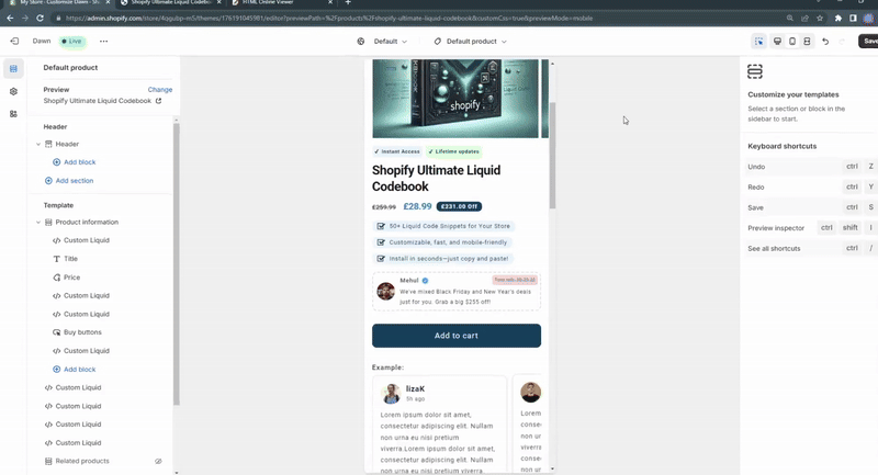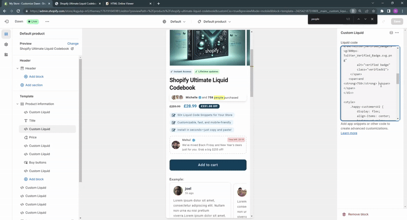 Liquid codes are snippets of customizable code designed to enhance your store’s functionality. With our pre-built codes, you can easily add features like custom product filters, dynamic pricing displays, or unique design elements—all without advanced coding knowledge.
