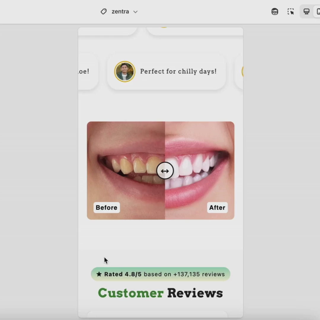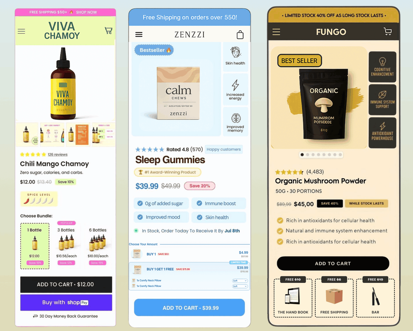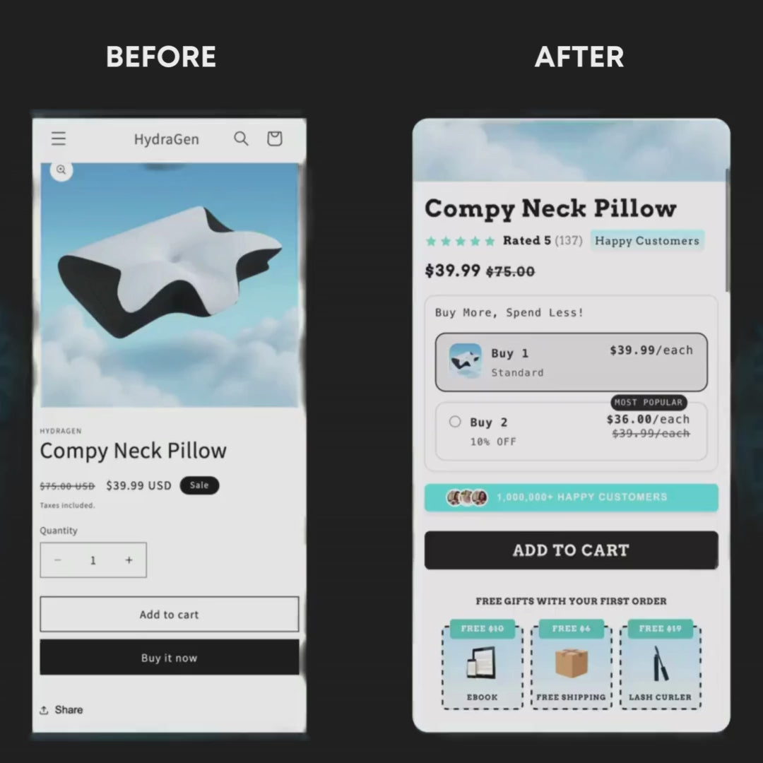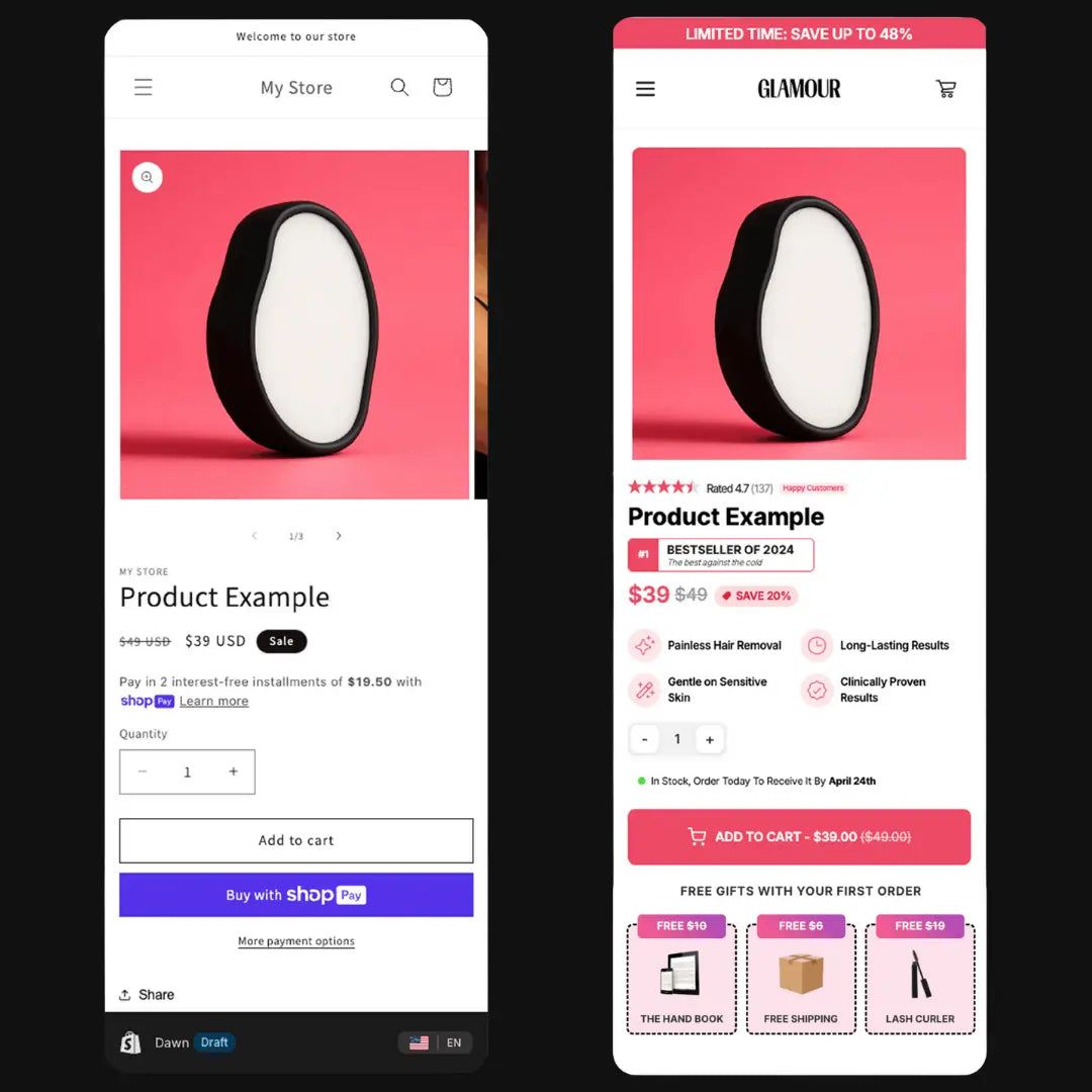 With the Codebook, you unlock 60+ conversion-focused sections that instantly transform your store into the version on the right: trust badges, reviews, urgency bars, clean design.