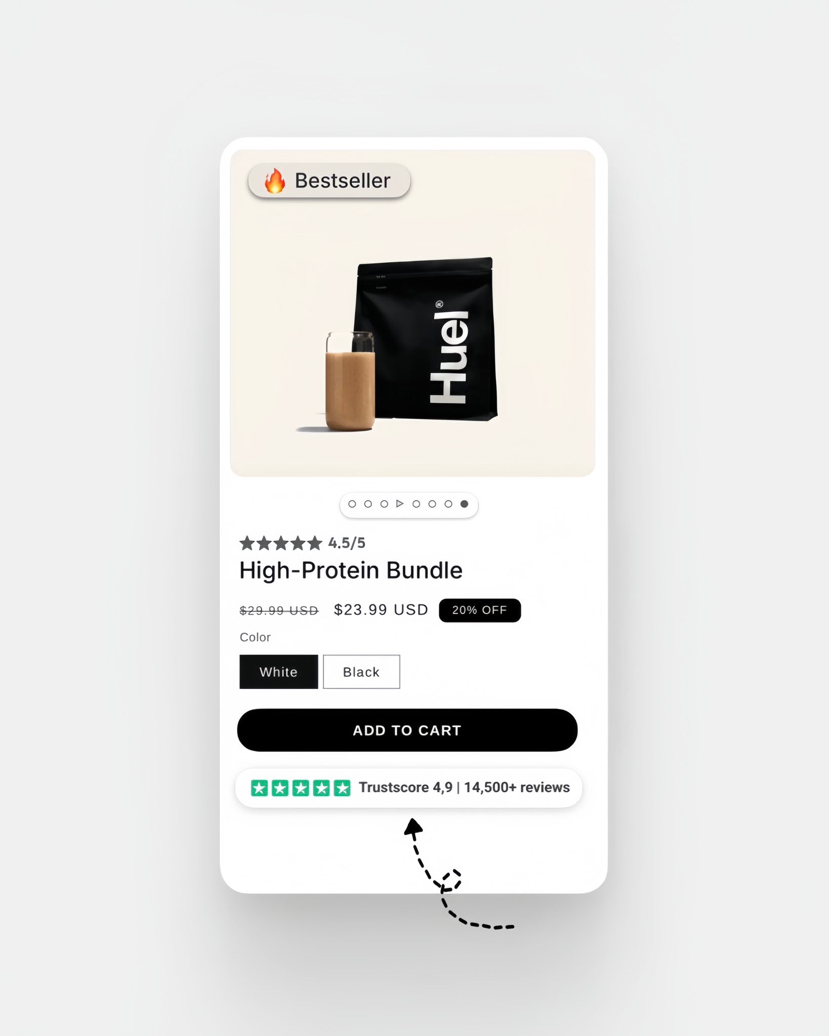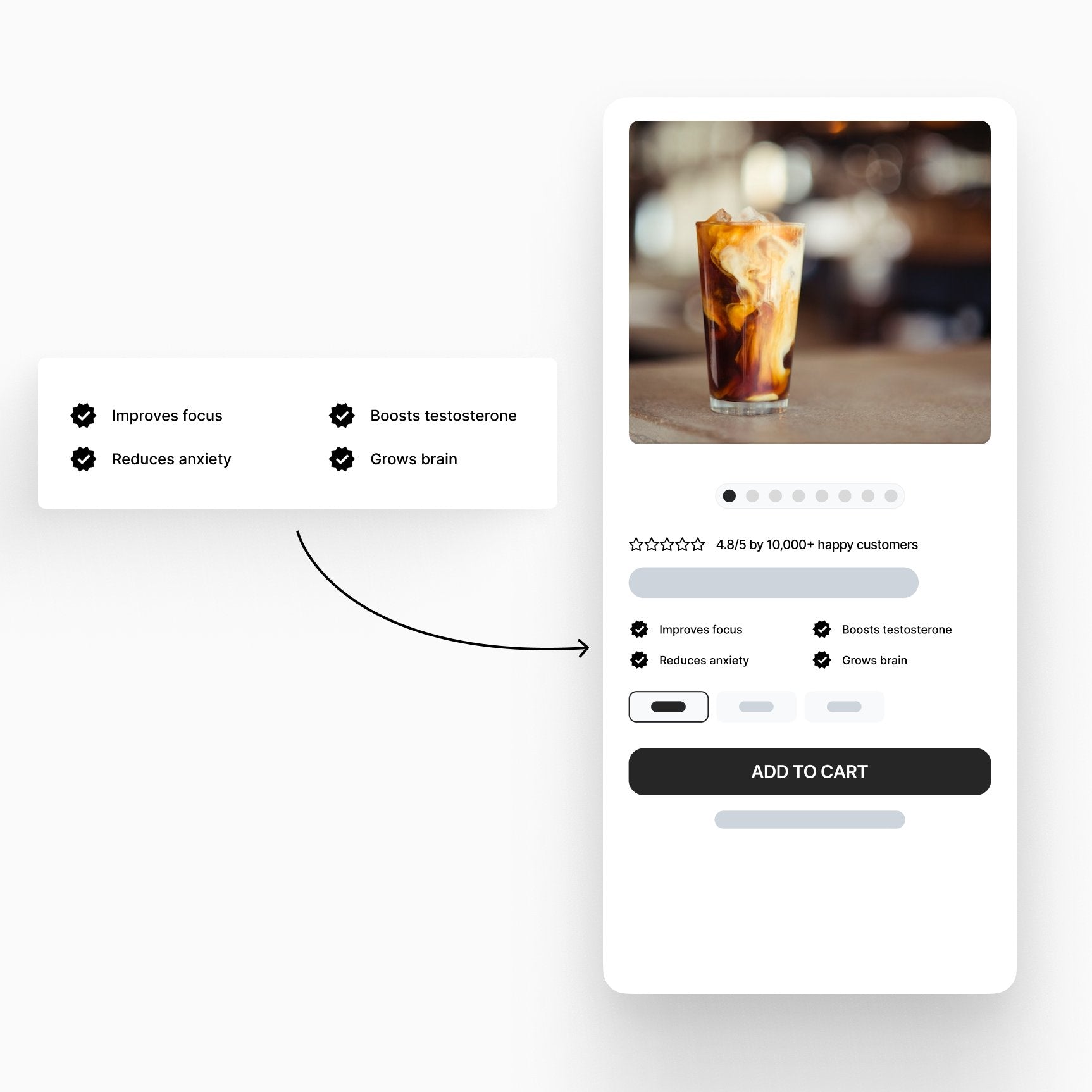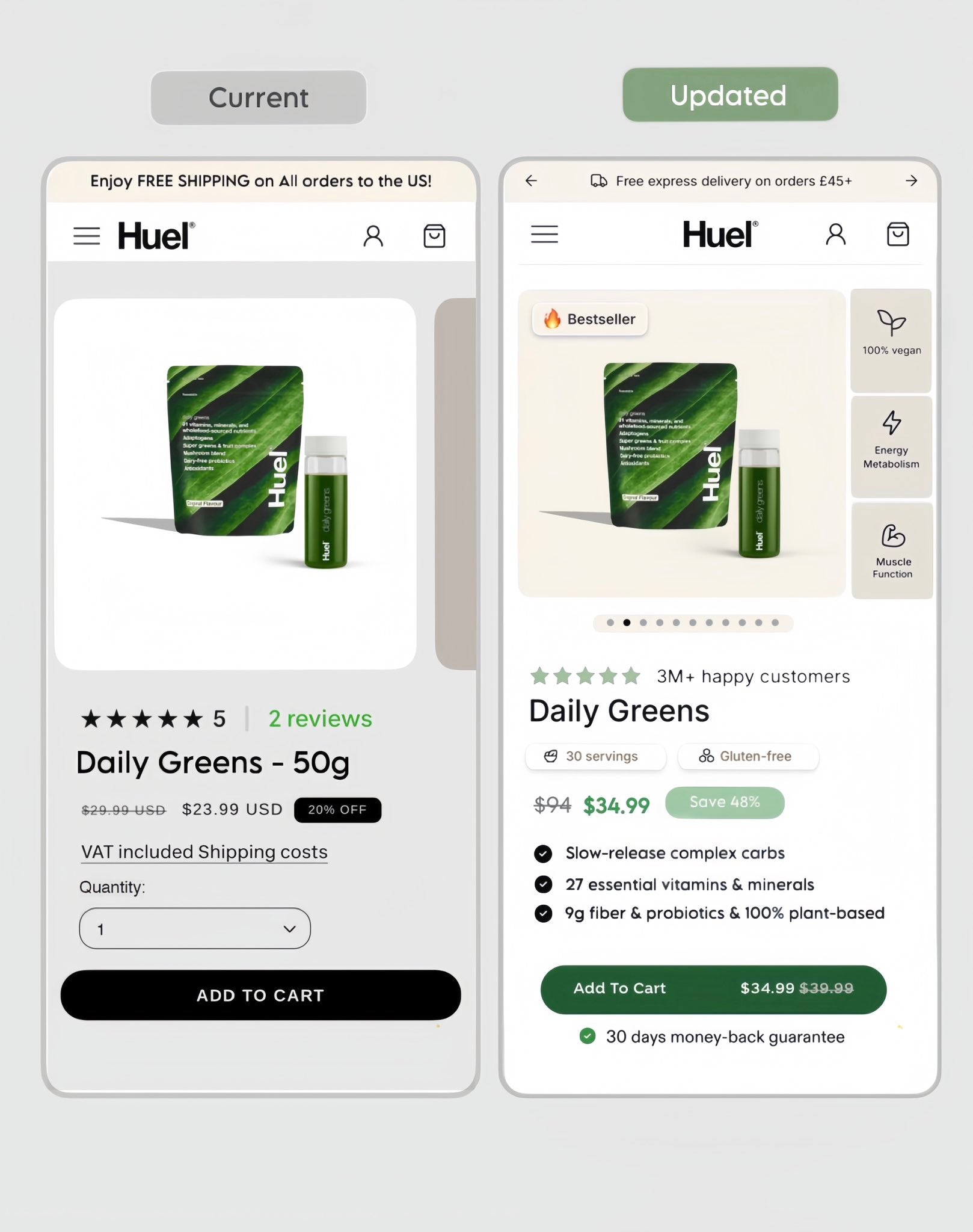 With the Codebook, you unlock 60+ conversion-focused sections that instantly transform your store into the version on the right: trust badges, reviews, urgency bars, clean design.